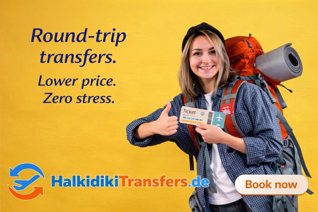 Enjoy a € 20-40 discount on your return transfer when you book a round-trip taxi from Thessaloniki Airport to Halkidiki. Secure your transfer today and travel with comfort and reliability.